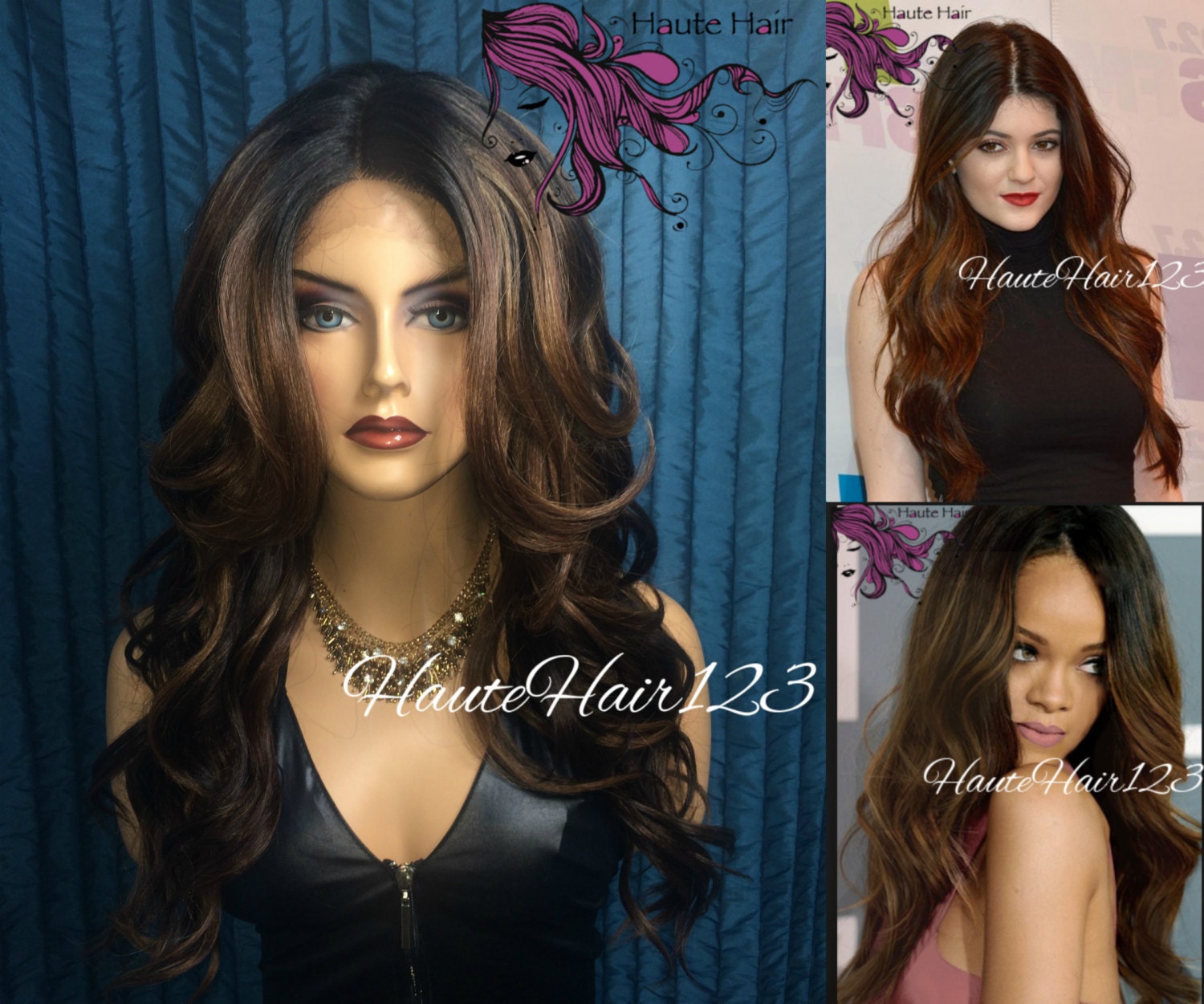Kylie Jenner Rihanna Inspired Soft Waves Brown blonde Highlights, Bombshell Wig, Balayage, Ombre Realistic Human Hair Blend Lace Front Wig