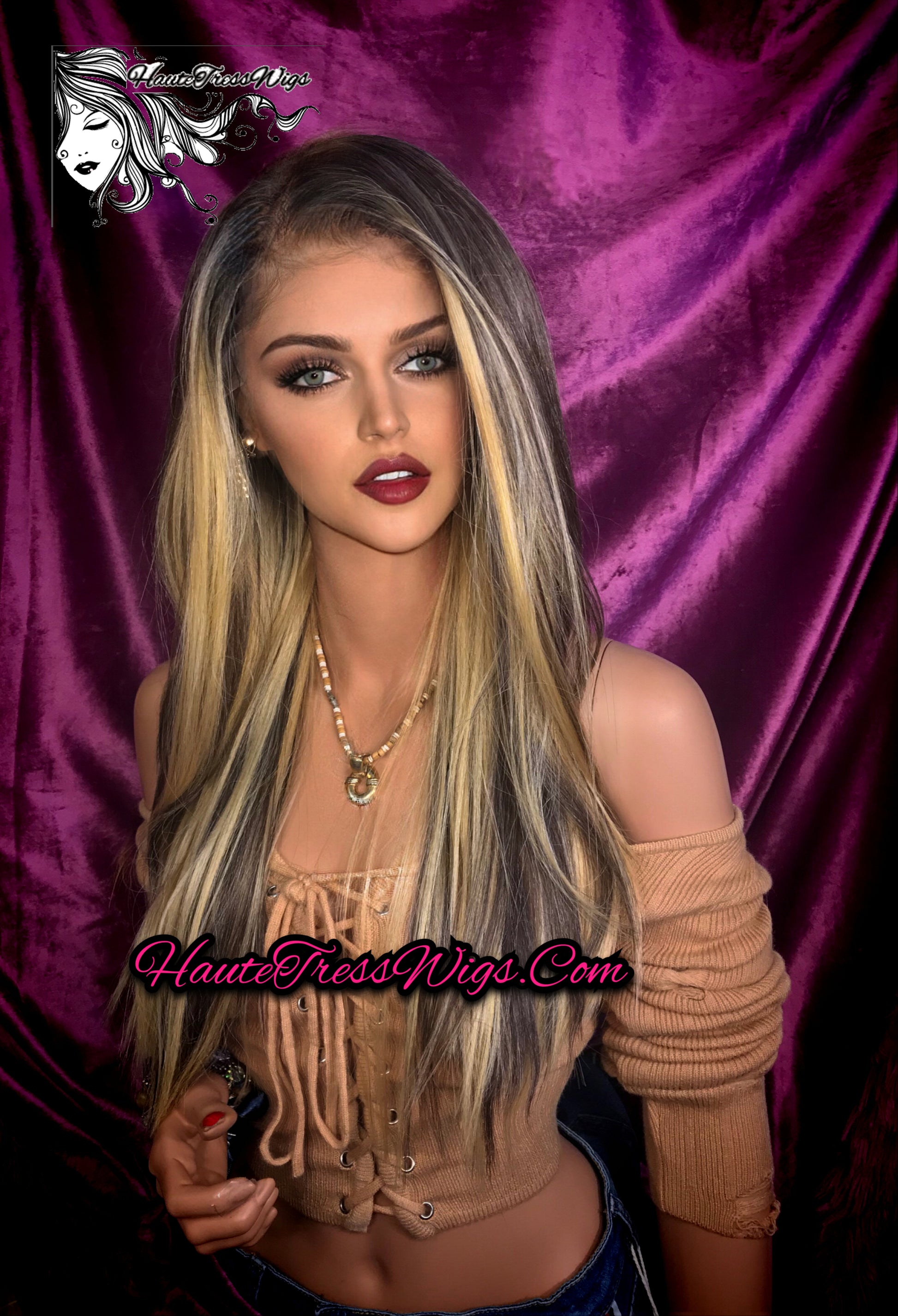 HauteTressWigs.Com presents: Money Piece, Chunky Highlight, Golden Blonde, Brown Mix, Human hair blend, HD Transparent Lace, Heat Safe, Lace Front Wig - Kallie
