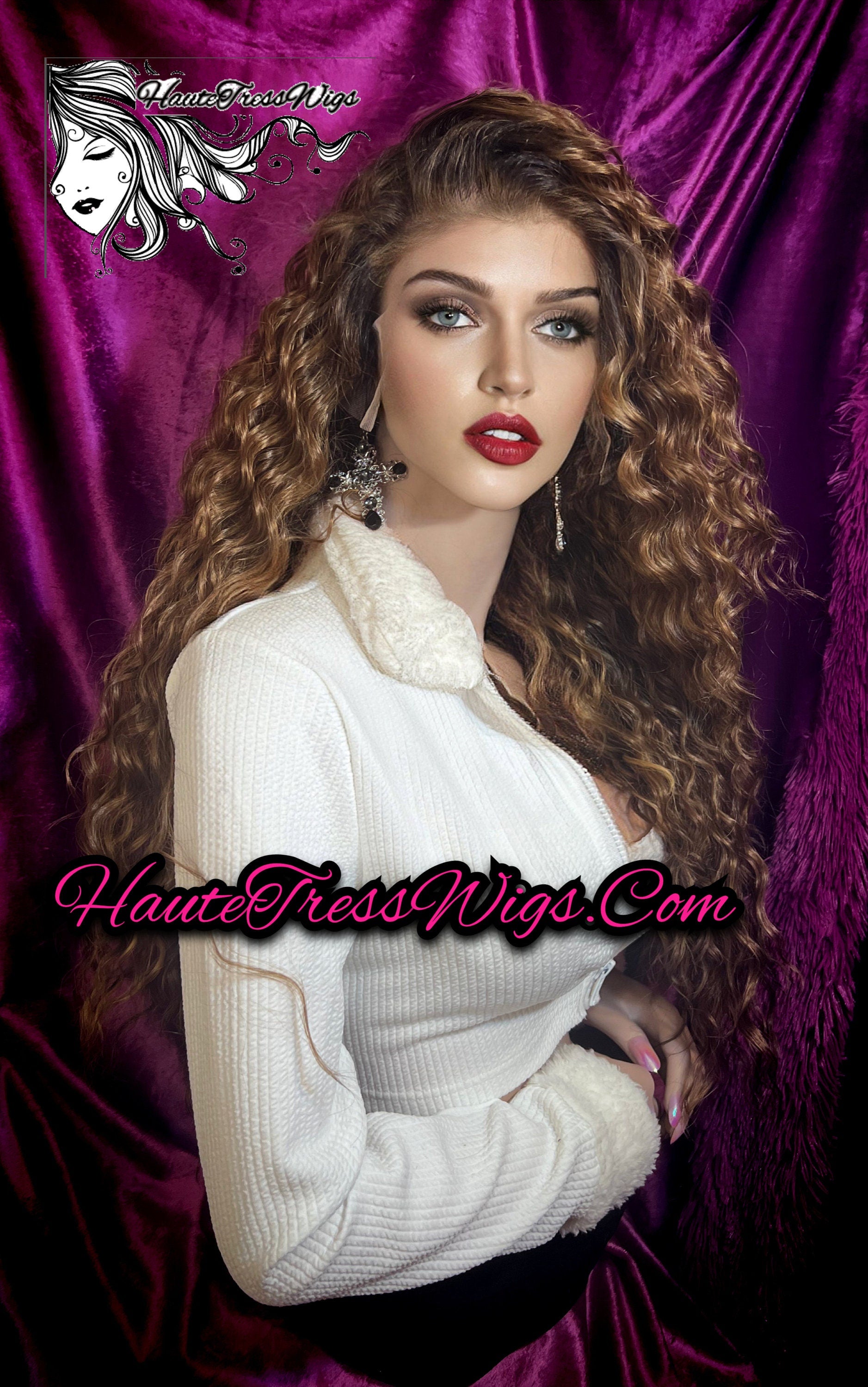 HauteTressWigs.Com Spanish Wave, Curly, Wavy, Balayage, Toffee Blonde, Brown Blonde Mix, Free Parting, Pre-Plucked Hairline, Human Hair Blend, Lace Front Wig - Chiariana